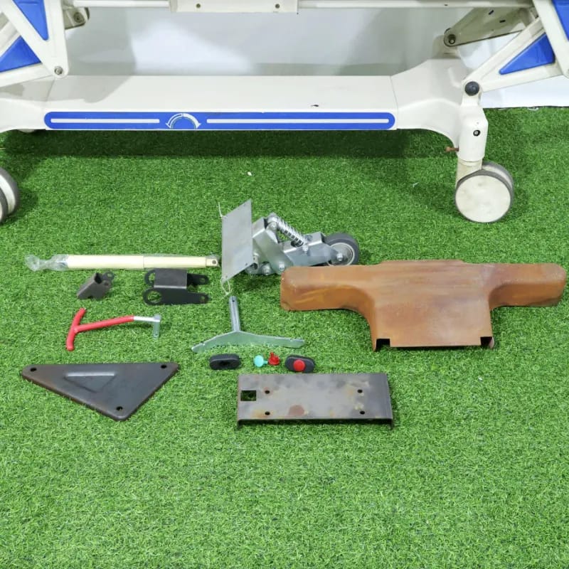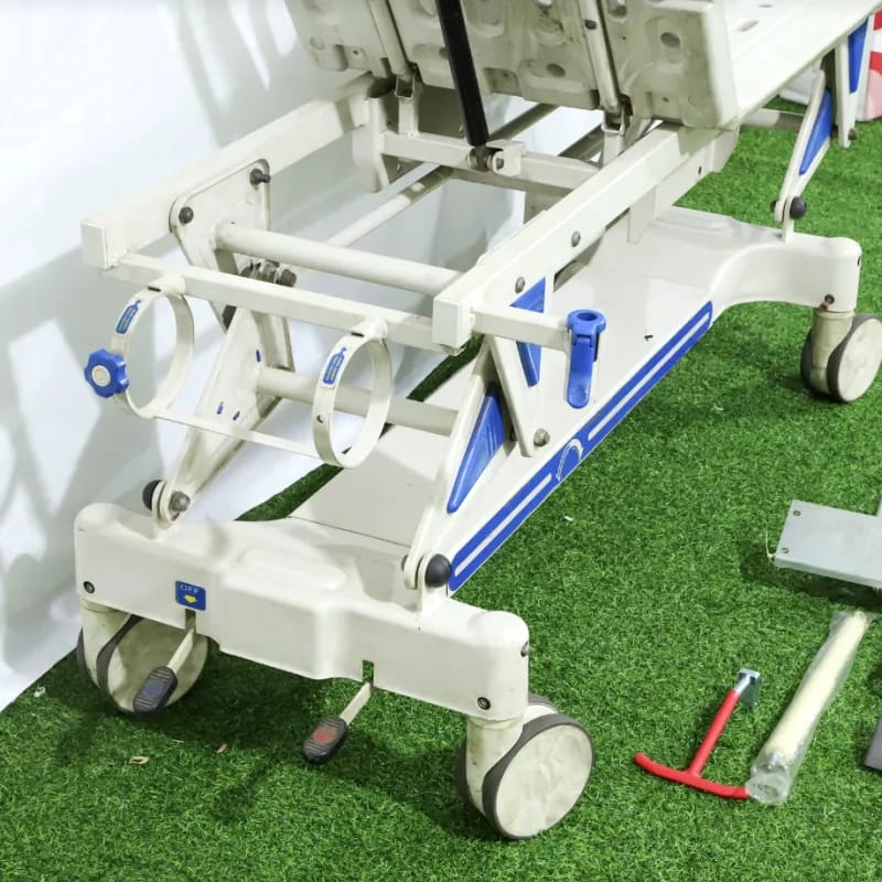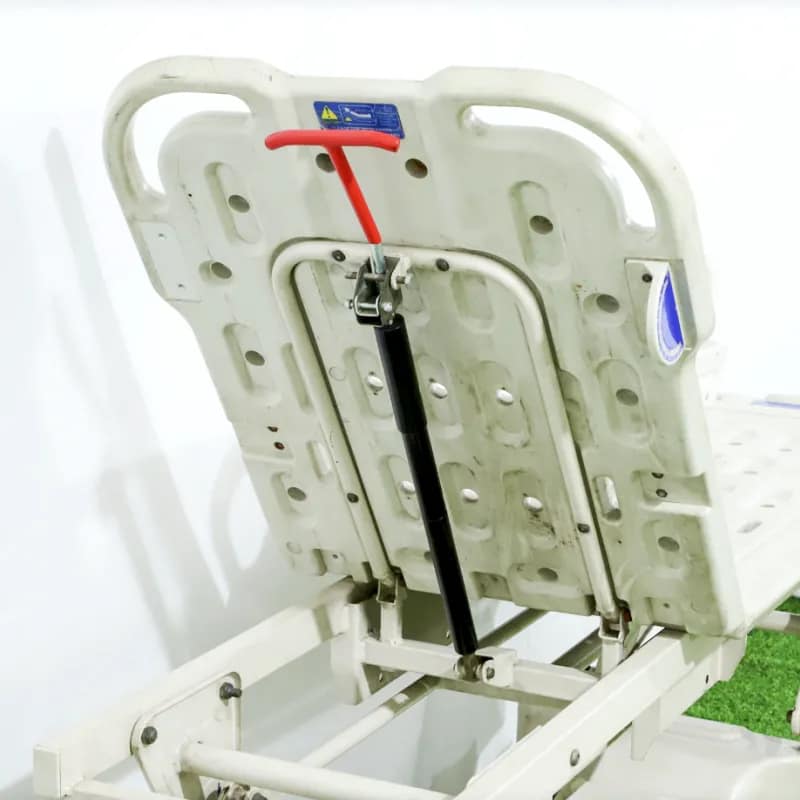 2. The bed surface is a two-piece, two-fold design, made entirely of engineering plastics, blow-molded in one piece. 3. The crank handle is made of chrome-plated iron, foldable, high-strength, flexible, and convenient, with a steel universal joint. 4. The screw has a two-way limit protection function; it adopts a “two-way limit protection” screw system. 5. There is one IV drip holder socket at each end of the bed, with a 20mm diameter hole, made of stamped metal. 6. Stainless steel double-section telescopic four-claw IV drip holder, 19mm diameter, sturdy and durable. 7.Integral injection molded ABS engineering plastic base cover |