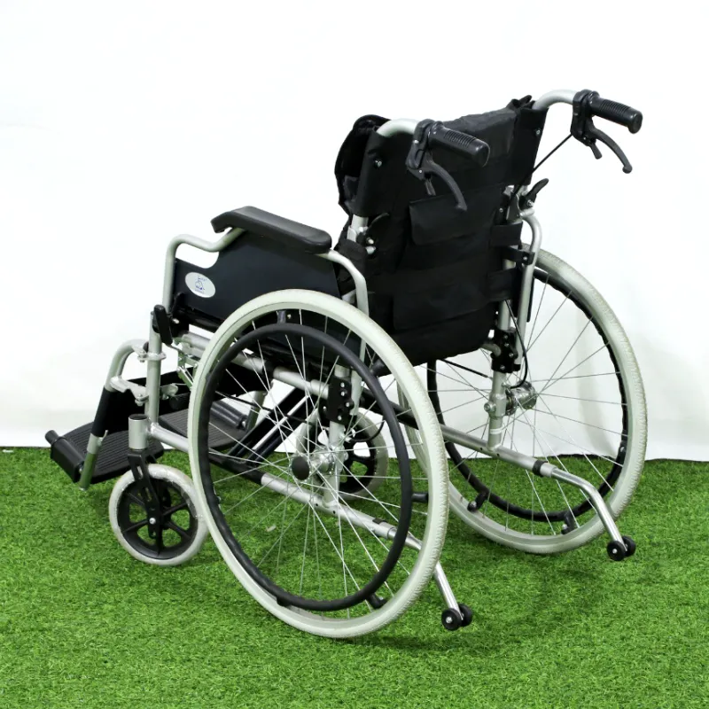 8. Front Wheels: 8-inch (20cm) PVC swivel tires with high-strength plastic hubs. Rear wheels: 24-inch (60 cm) solid rubber rear wheels with excellent shock absorption, equipped with a handwheel mechanism (for direct hand-powered wheelchair operation).