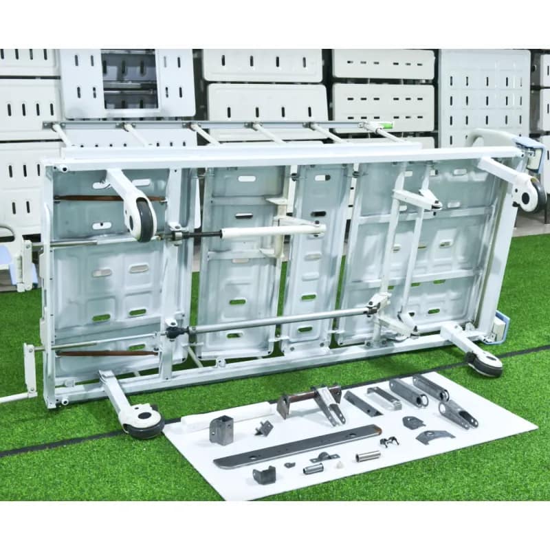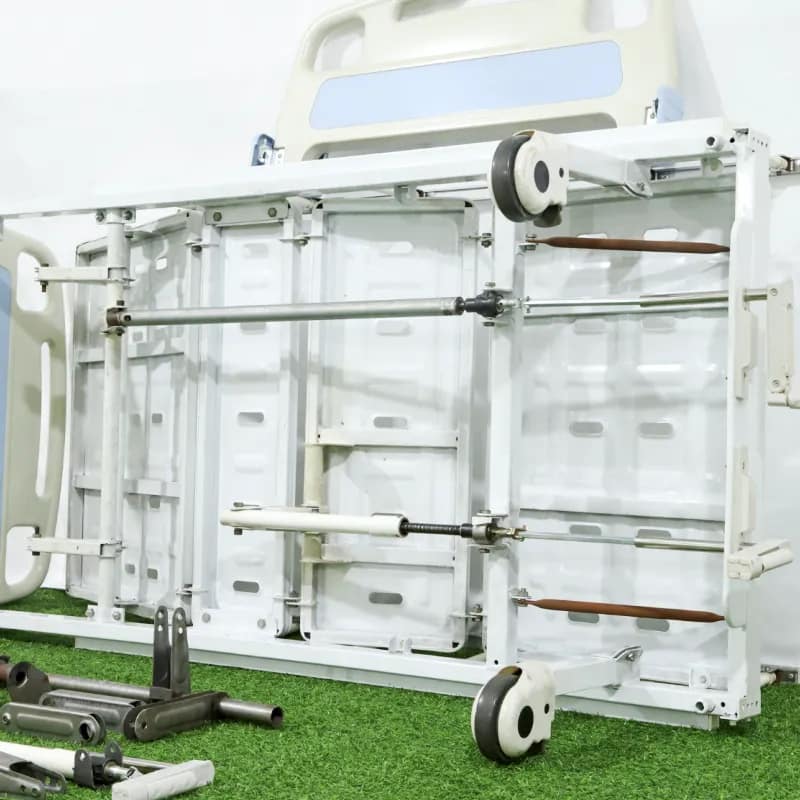 The double-crank manual bed features a manual crank lift system, providing back and knee lift functions. Its snap-on construction, made of ABS engineering plastic, allows for easy disassembly in 30 seconds, making it convenient for emergency treatment or shampooing. Standard slots accommodate IV stands, dining tables, and toilet boards, enabling a single bed for multiple scenarios.